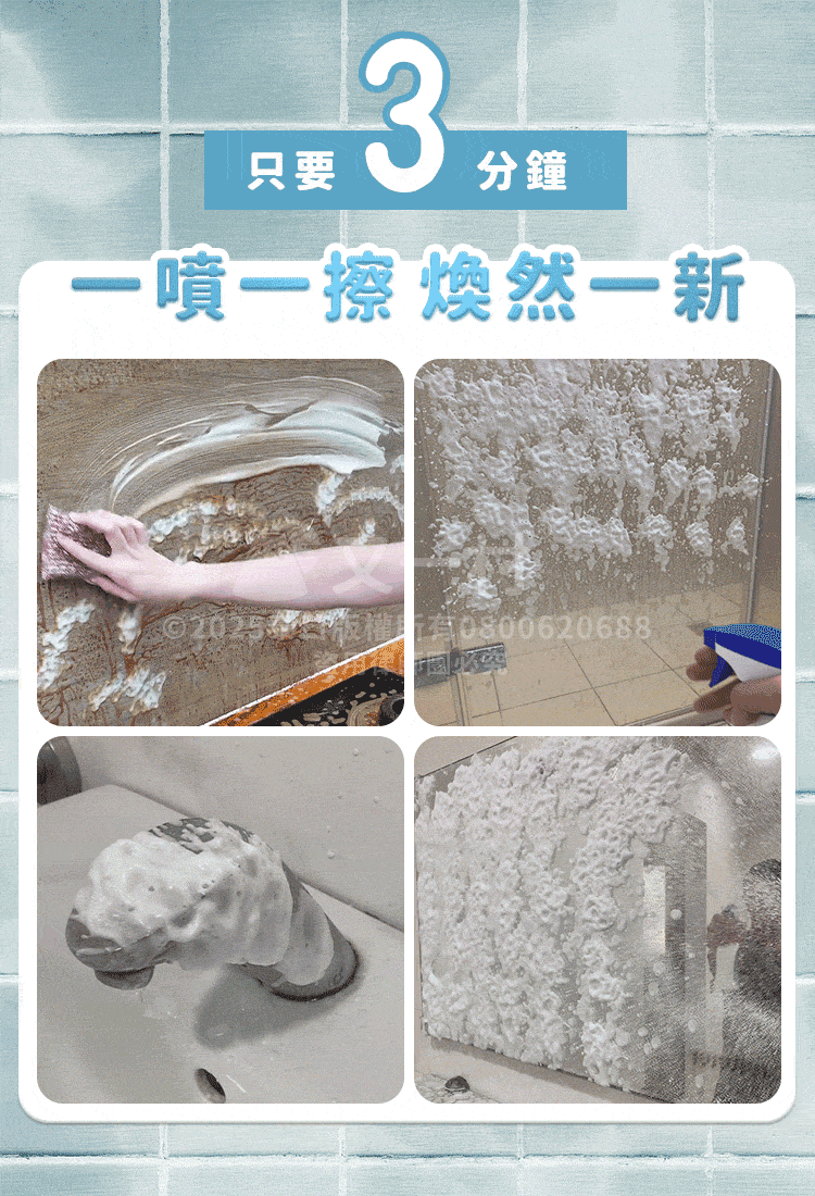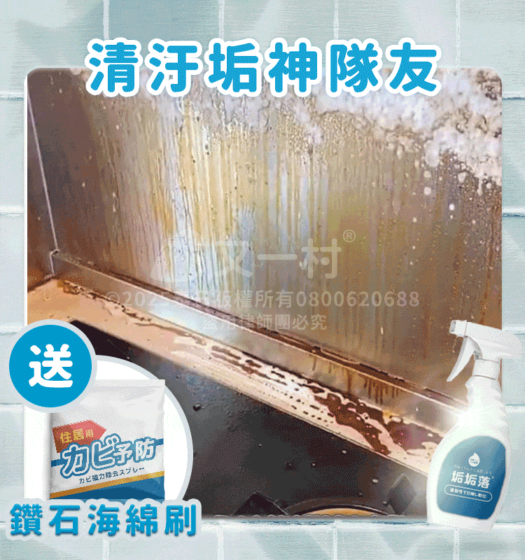 噴上去靜置15分鐘後,用贈品黑科技鑽石海綿刷刷洗就好囉!