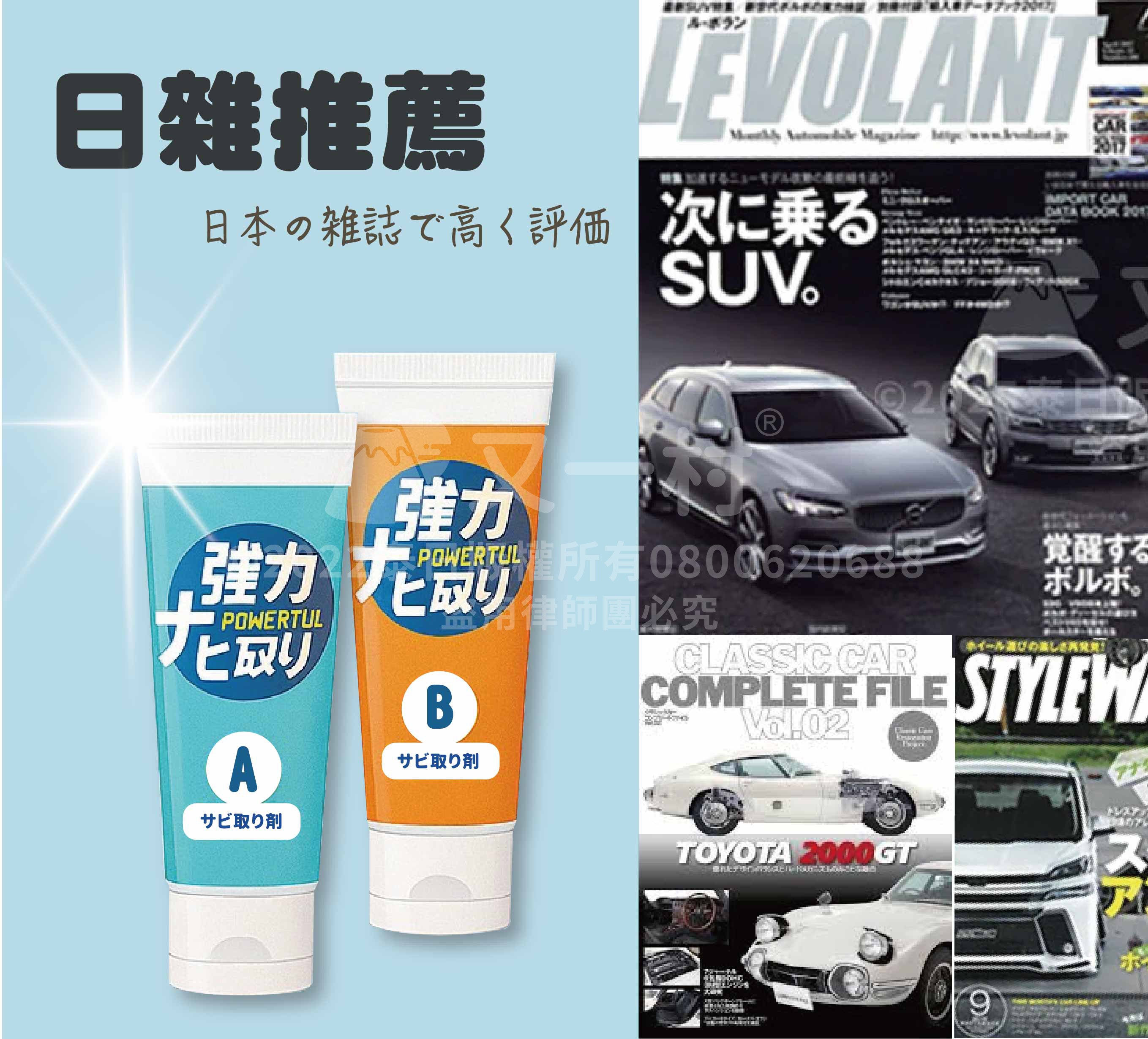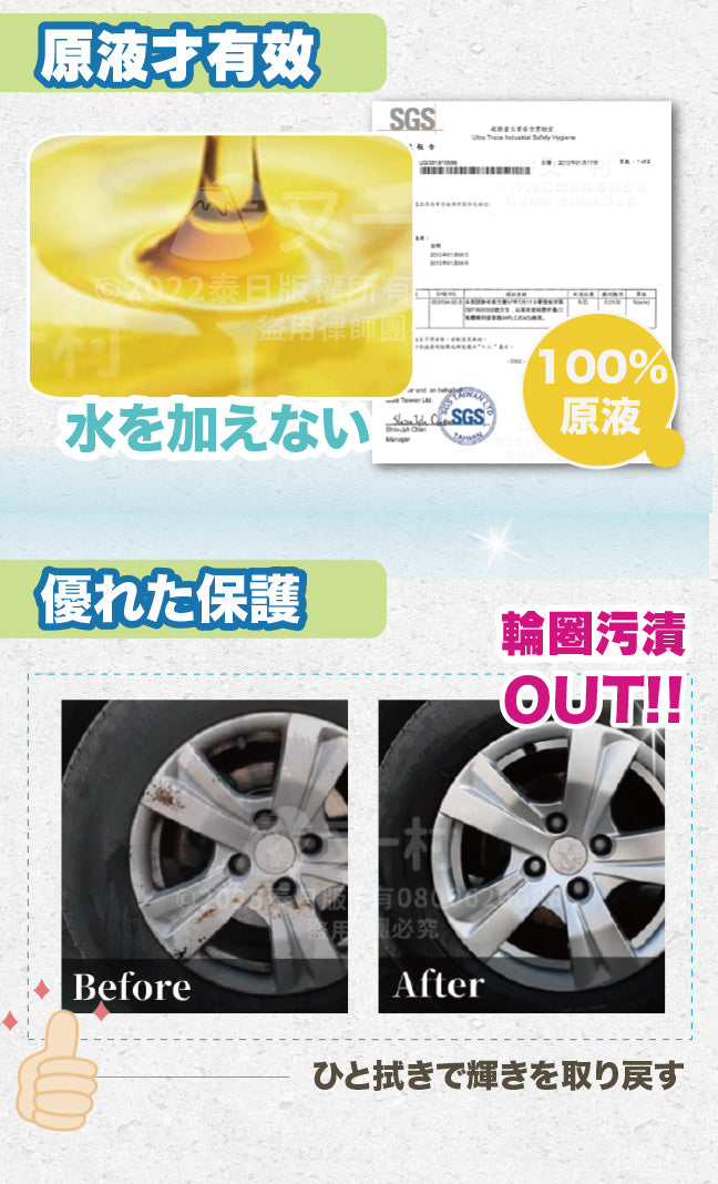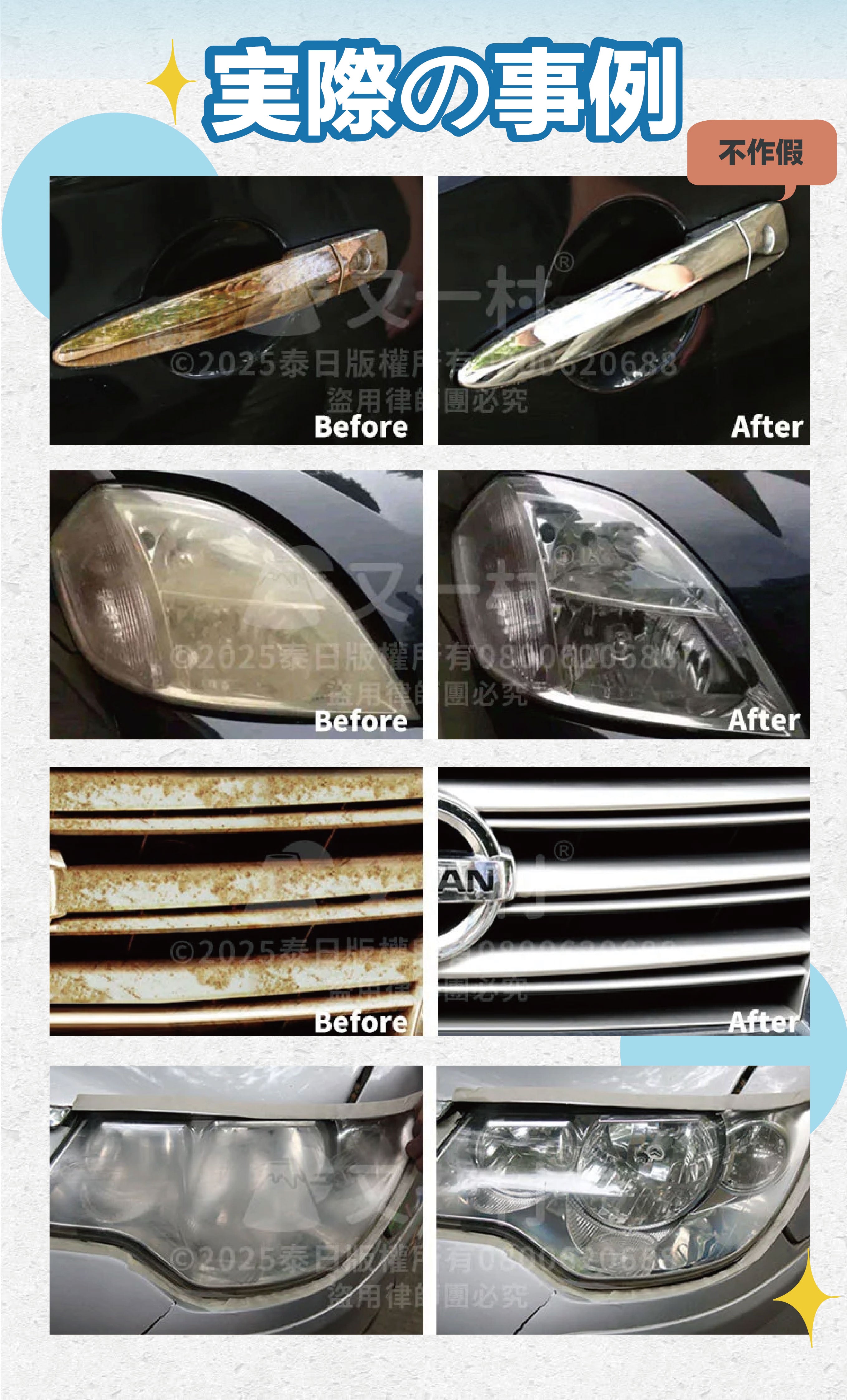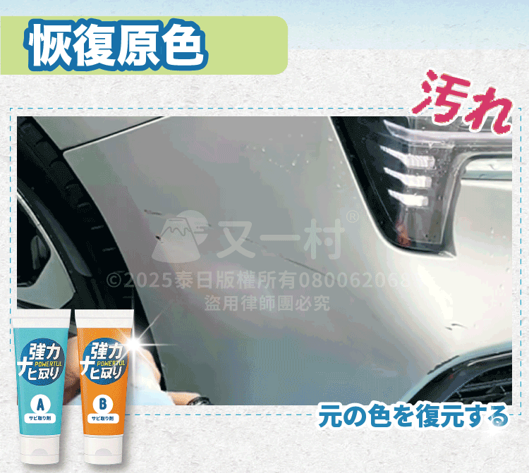 1.請勿使用於已經劣化的漆面、輪胎、橡膠、玻璃、皮革、磨砂、紋路加工的表面以及經過特殊處理的部位。