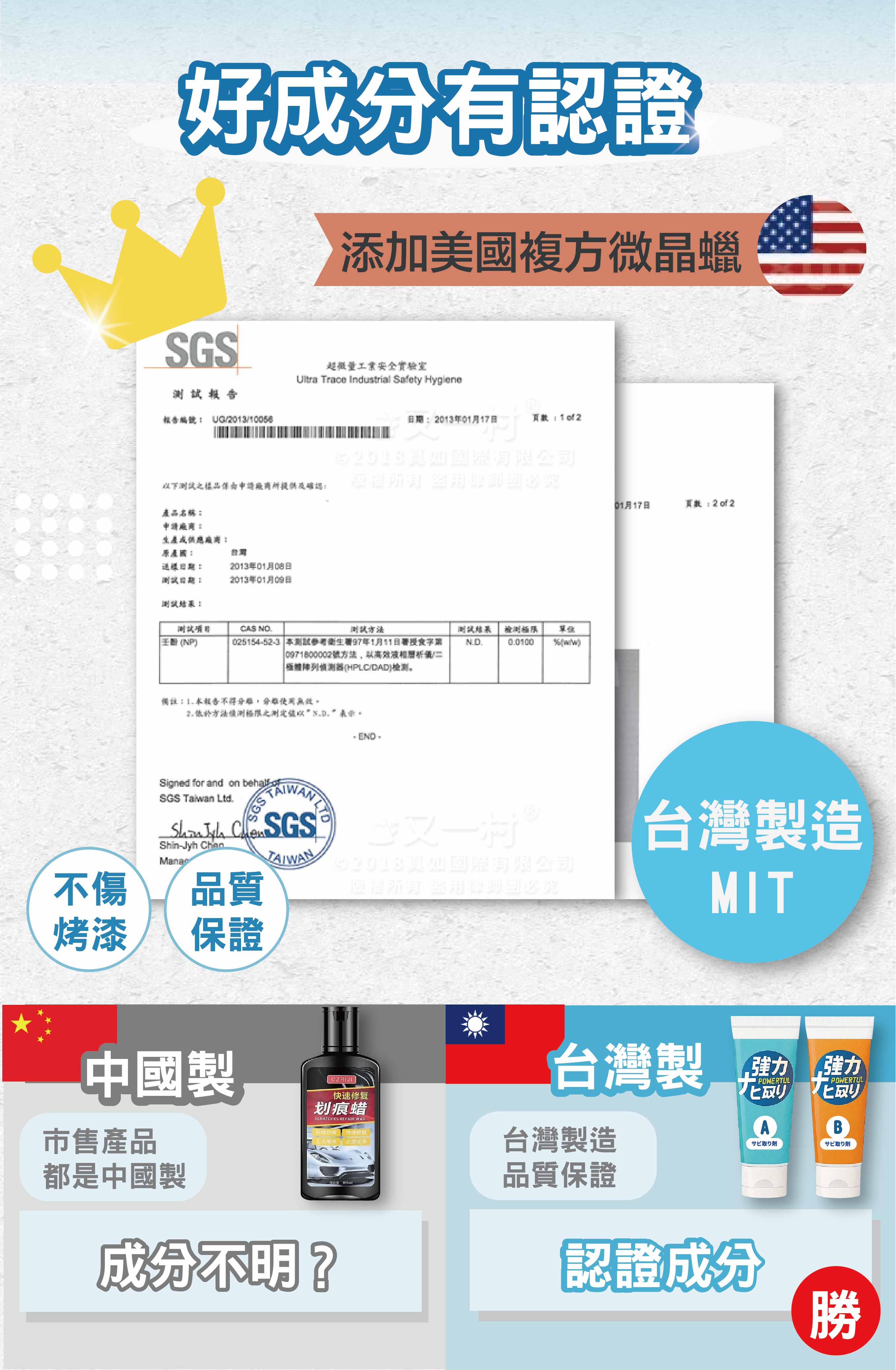 B劑. 亮光還原劑: synthetic wax、溶劑solvent、emulsifier、水、聚合矽silicone